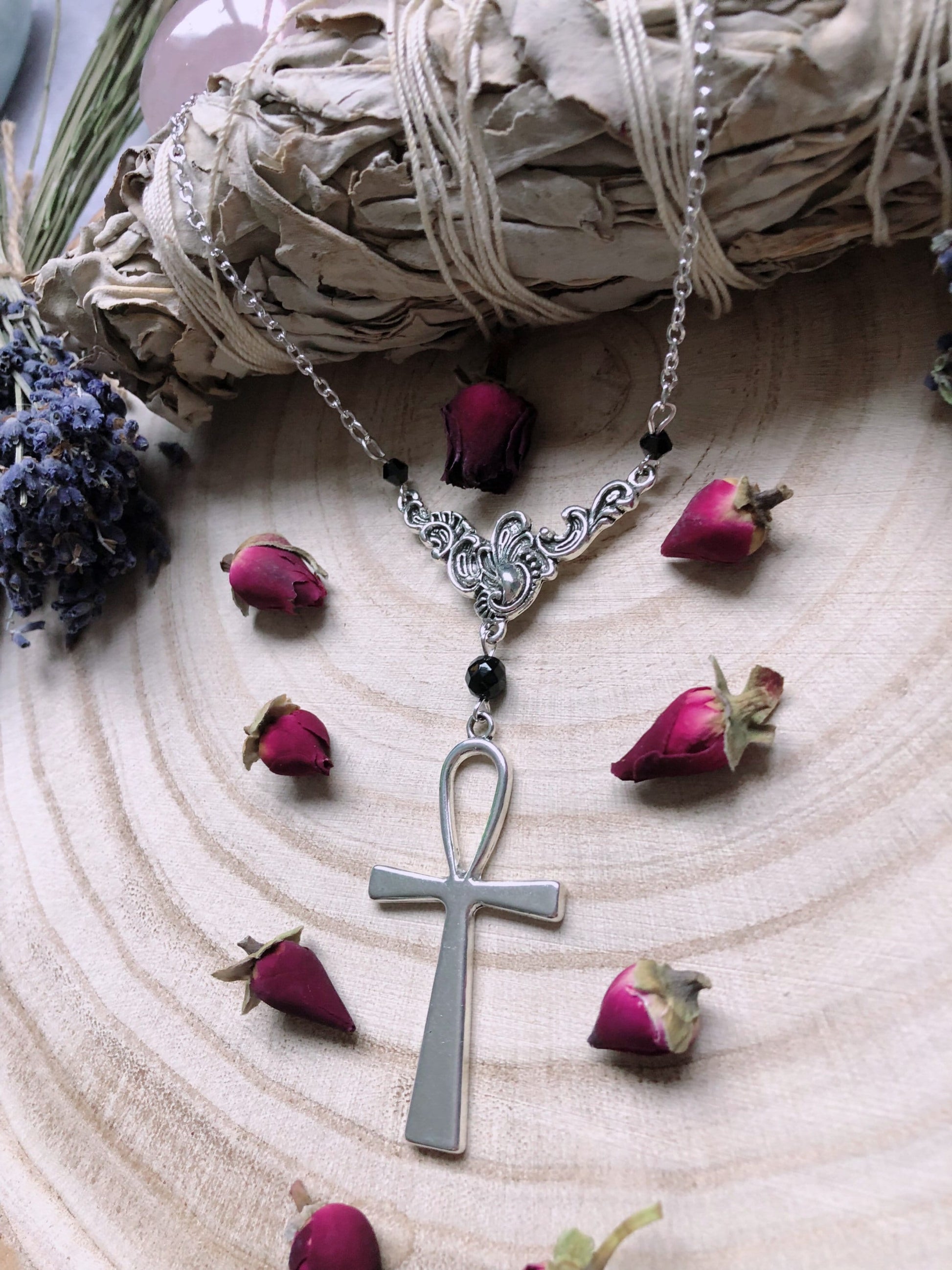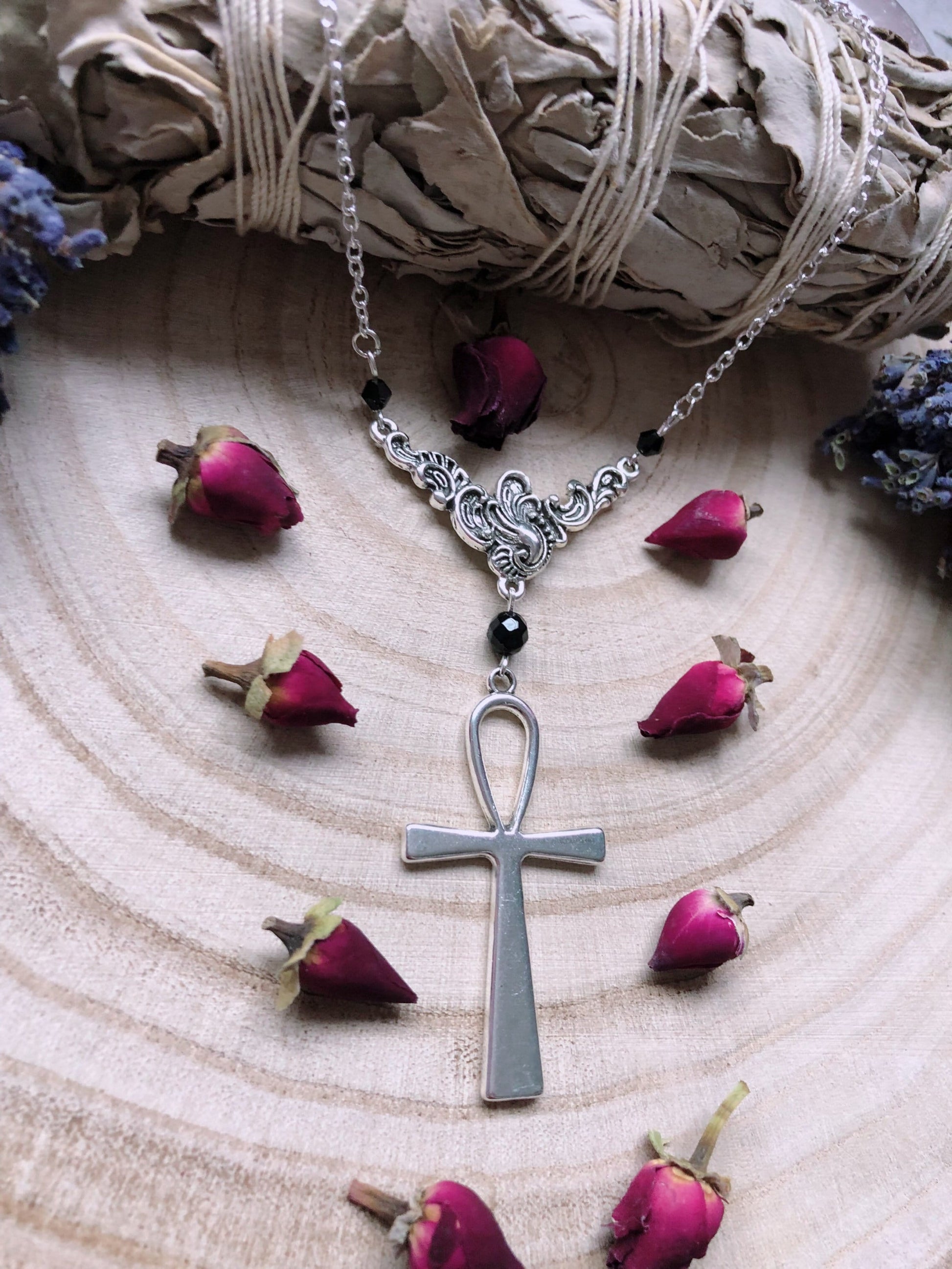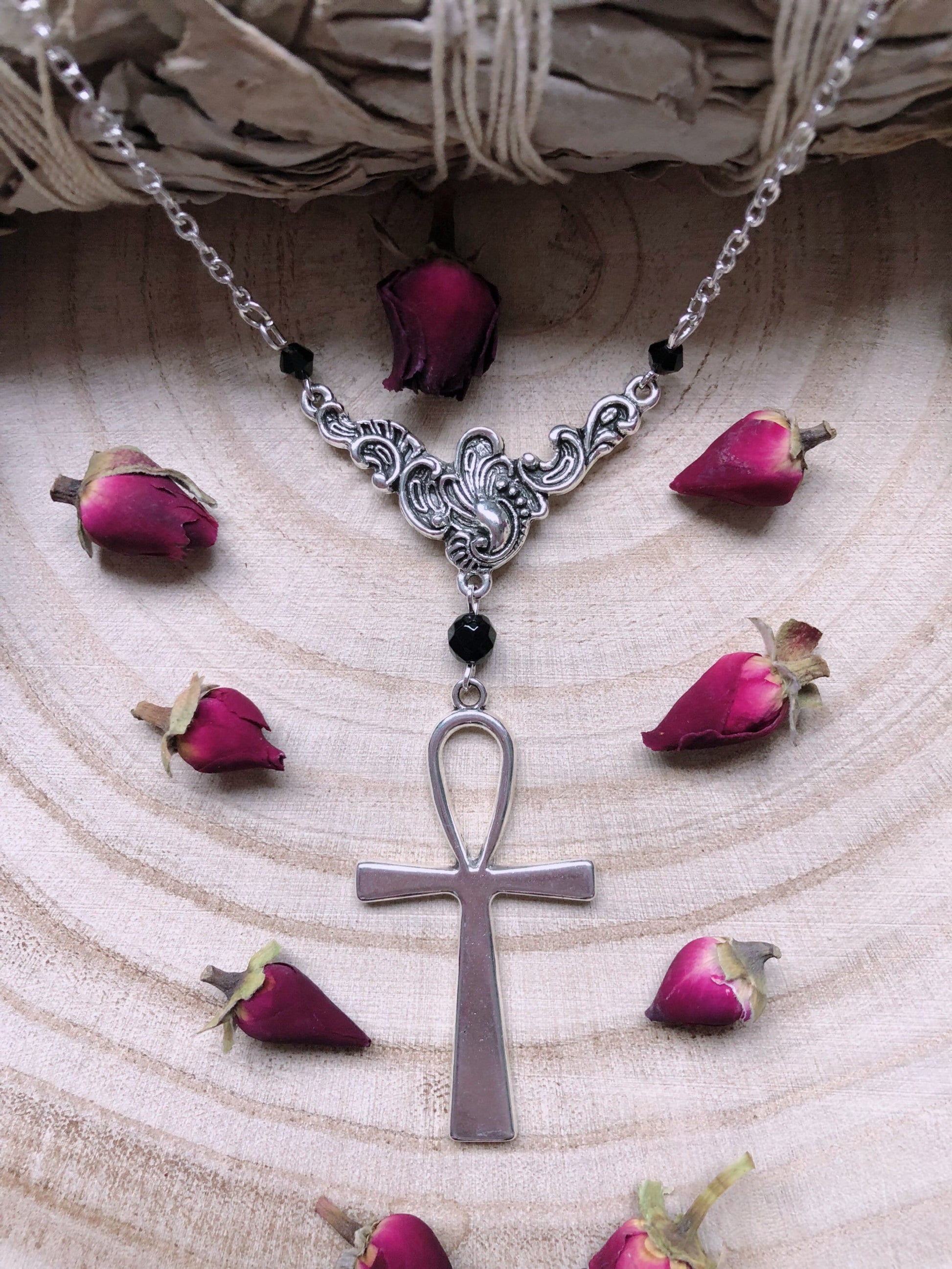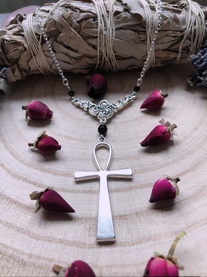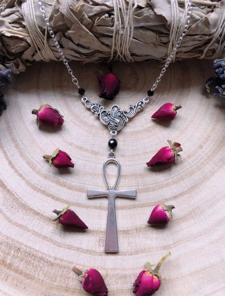 From A Silver Plated Chain Sits An Ornate Filigree Pendant, Suspending A Gorgeous Ankh Adorned With Black Austrian Crystal Beads