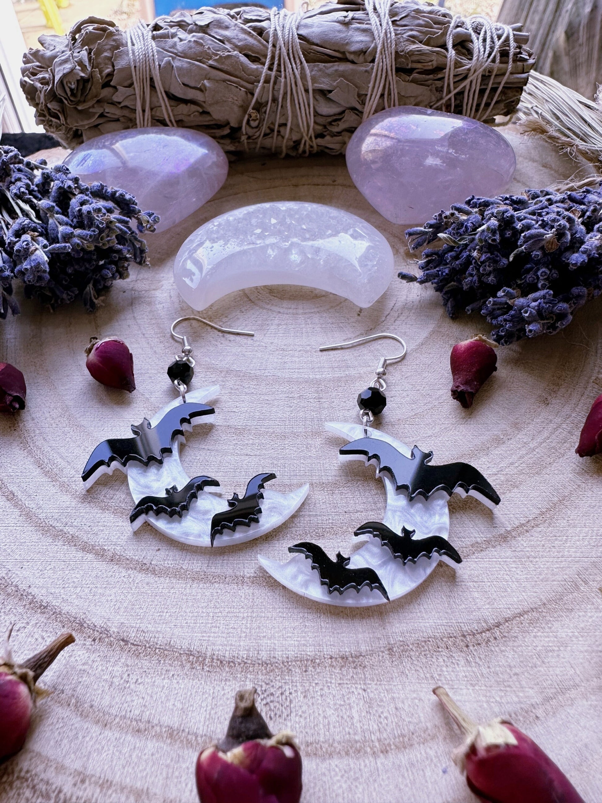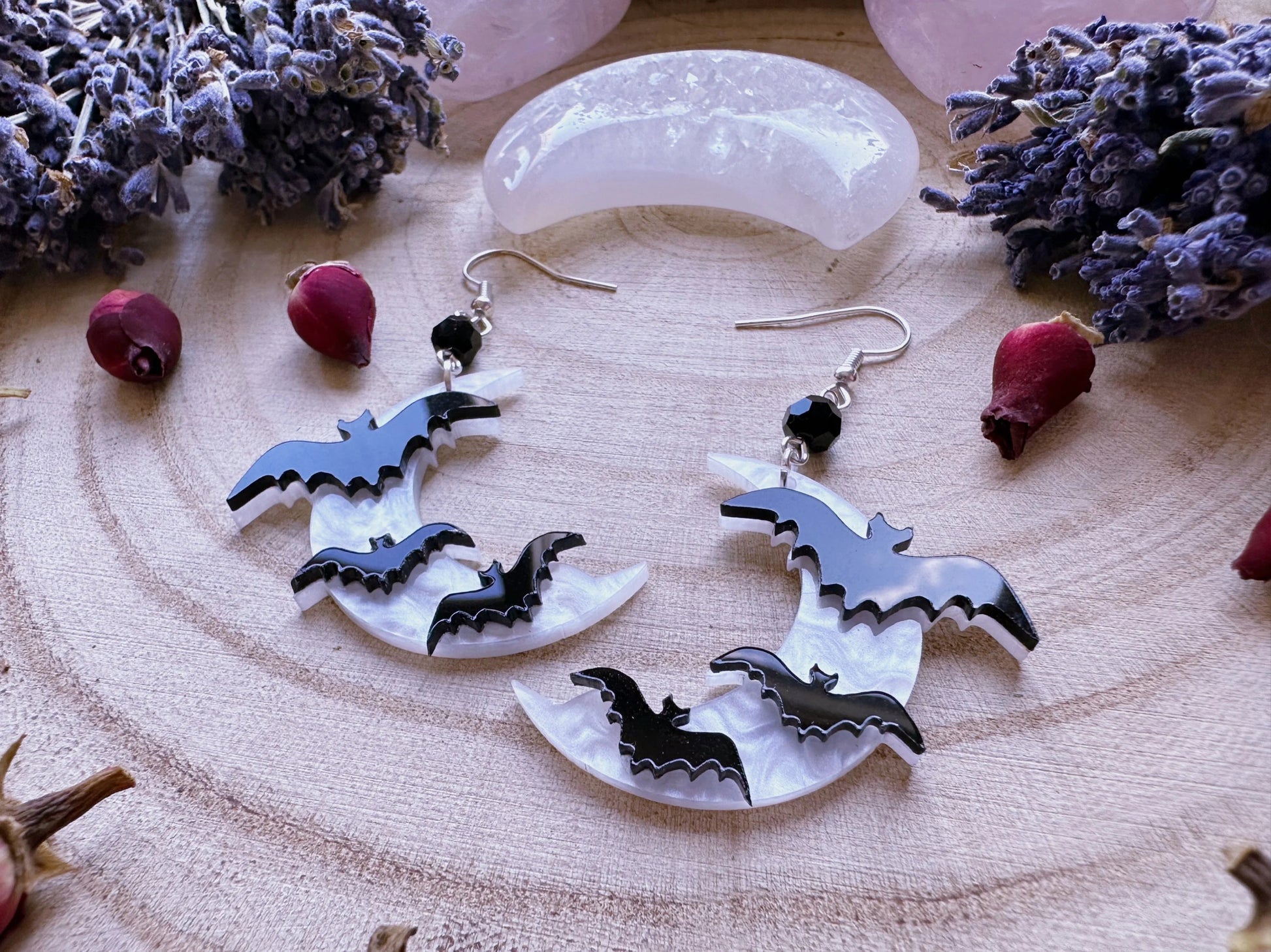 Absolutely Stunning White Shimmering Crescent Moons With 3 Glossy Black Bats In Flight, Adorned With The Most Beautiful Black Austrian Crystal Beads