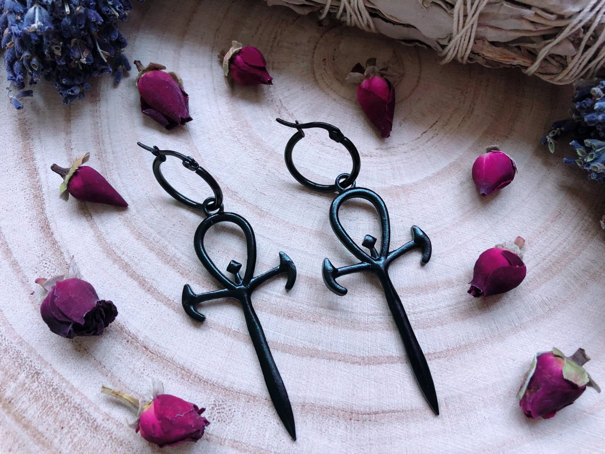 Gothic Black Ankh Of The Underworld Hoop Earrings