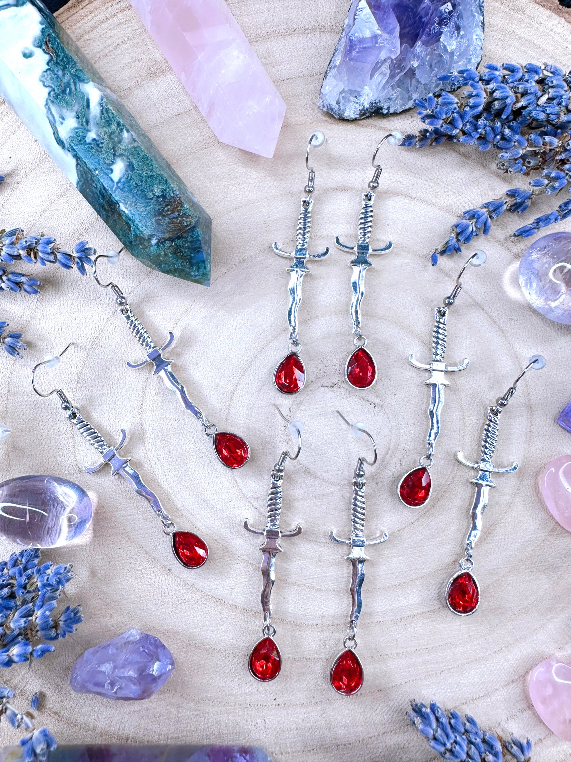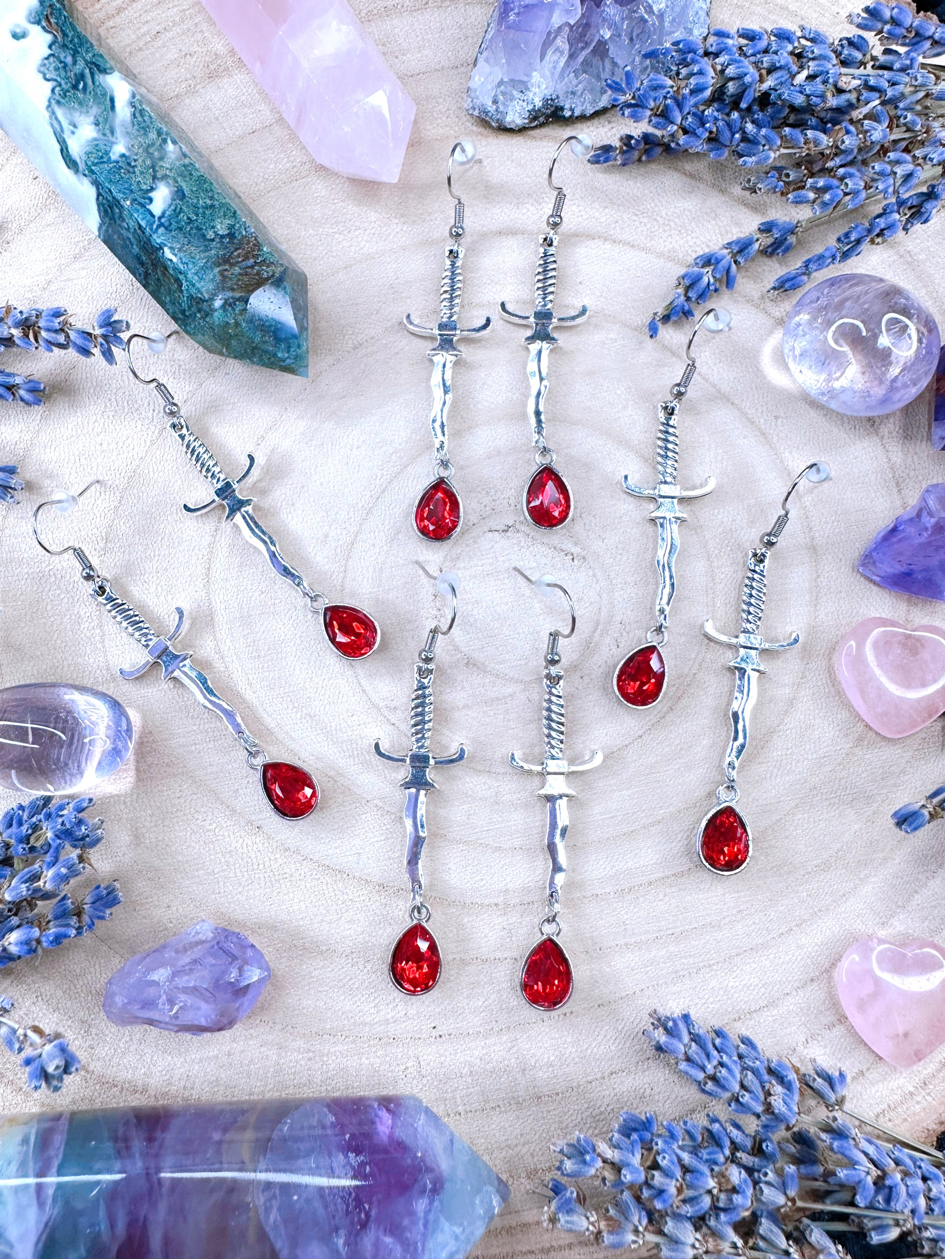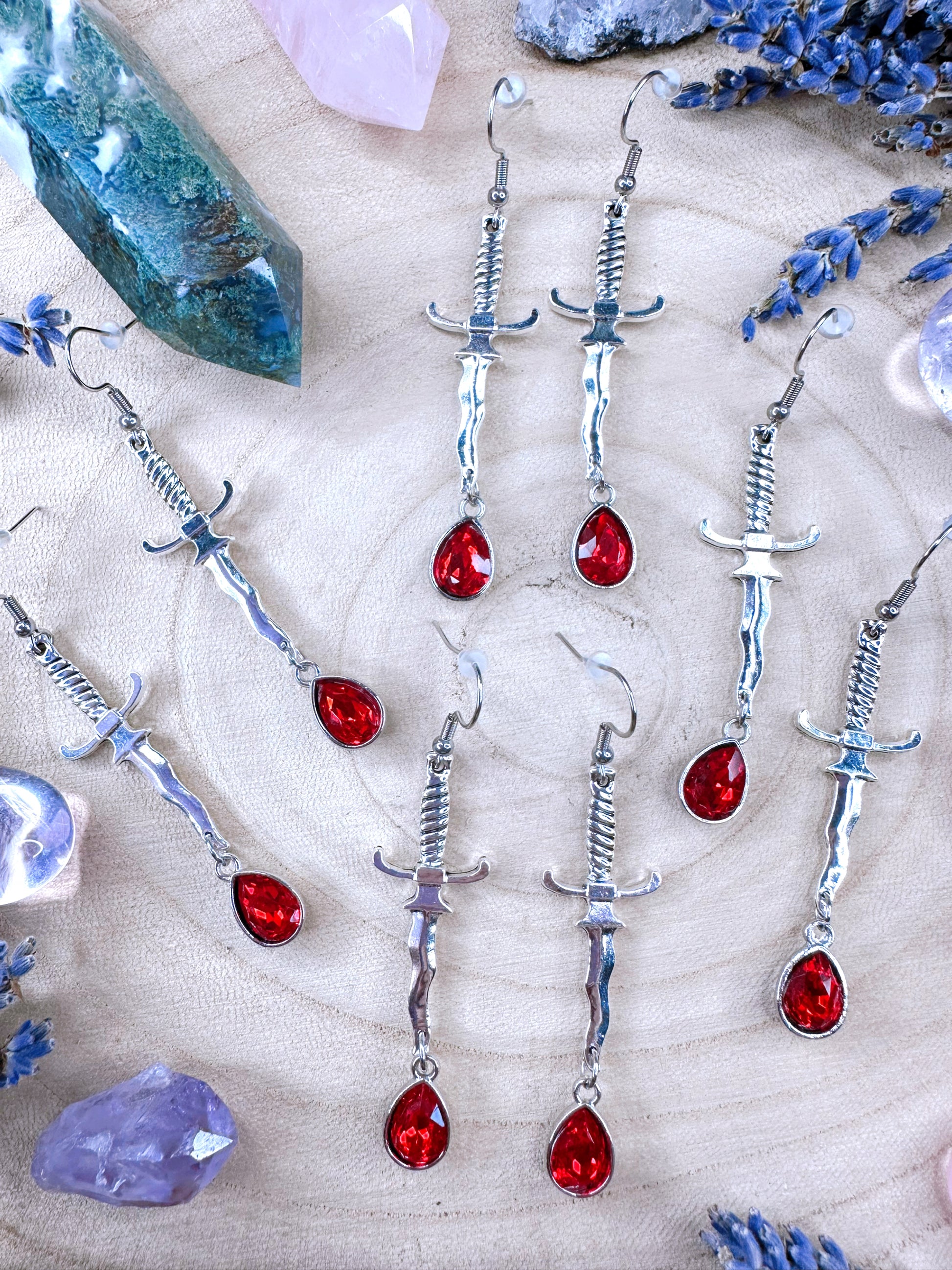 A Silver Coloured Dagger Suspends A Gorgeous Blood Droplet Gemstone