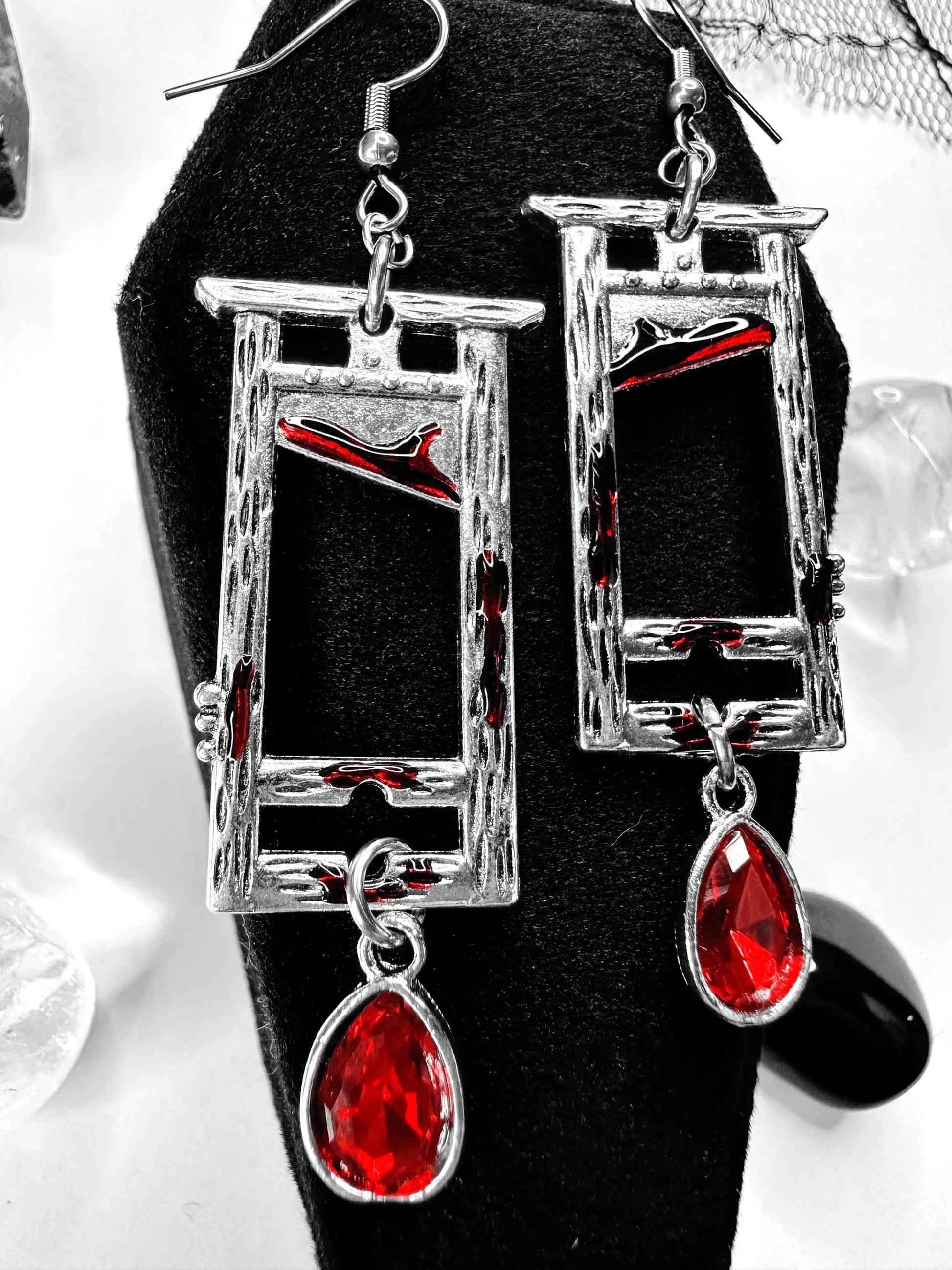 A Silver Coloured Guillotine With Blood Drips Suspends A Gorgeous Blood Droplet Gemstone