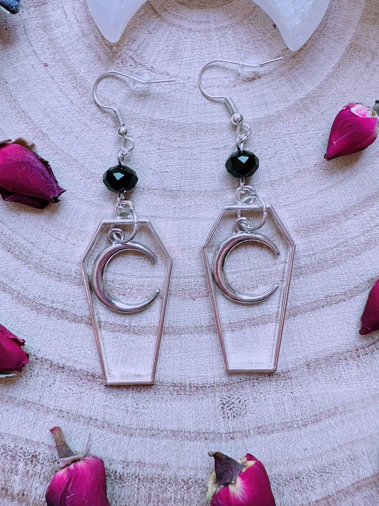 Beautiful Crescent Moon's Suspended From A Gorgeous Coffin, Adorned With Black Austrian Crystal Beads