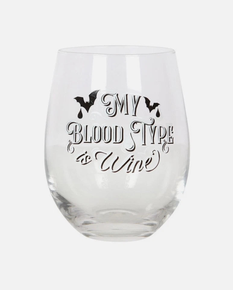 Clear Glass With Black & White Detailing To The Front Which Reads “ My Blood Type Is Wine “ Lovingly Adorned With Gothic Bats 🦇