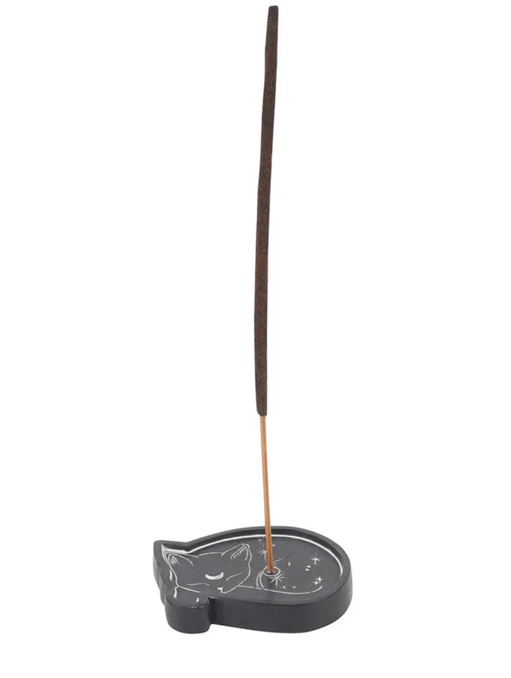 This black resin incense holder comes in the shape of a mystical sleeping cat and is compatible with both incense sticks and cones.