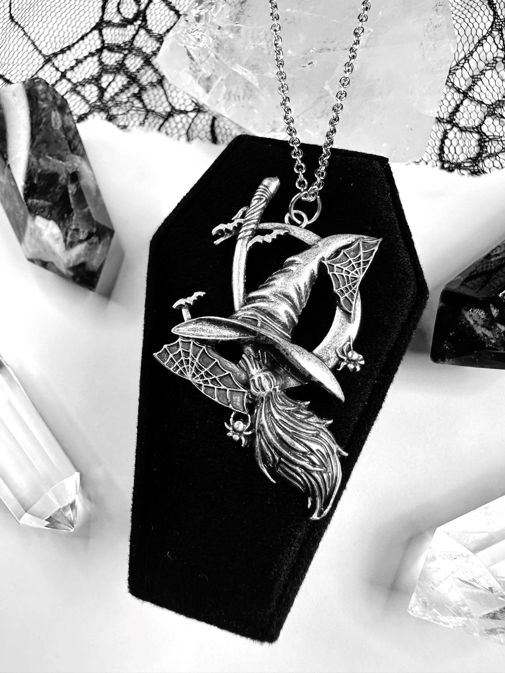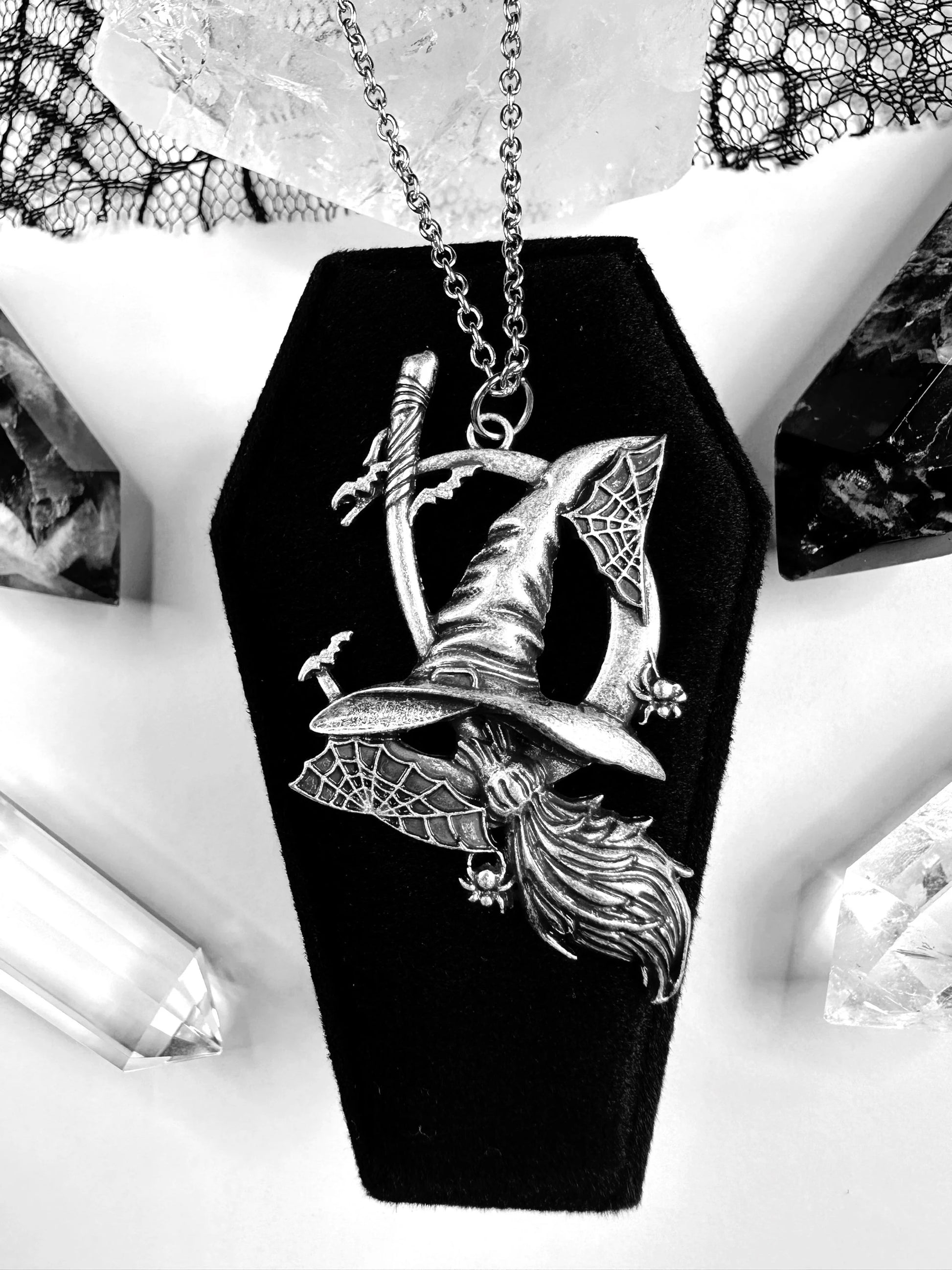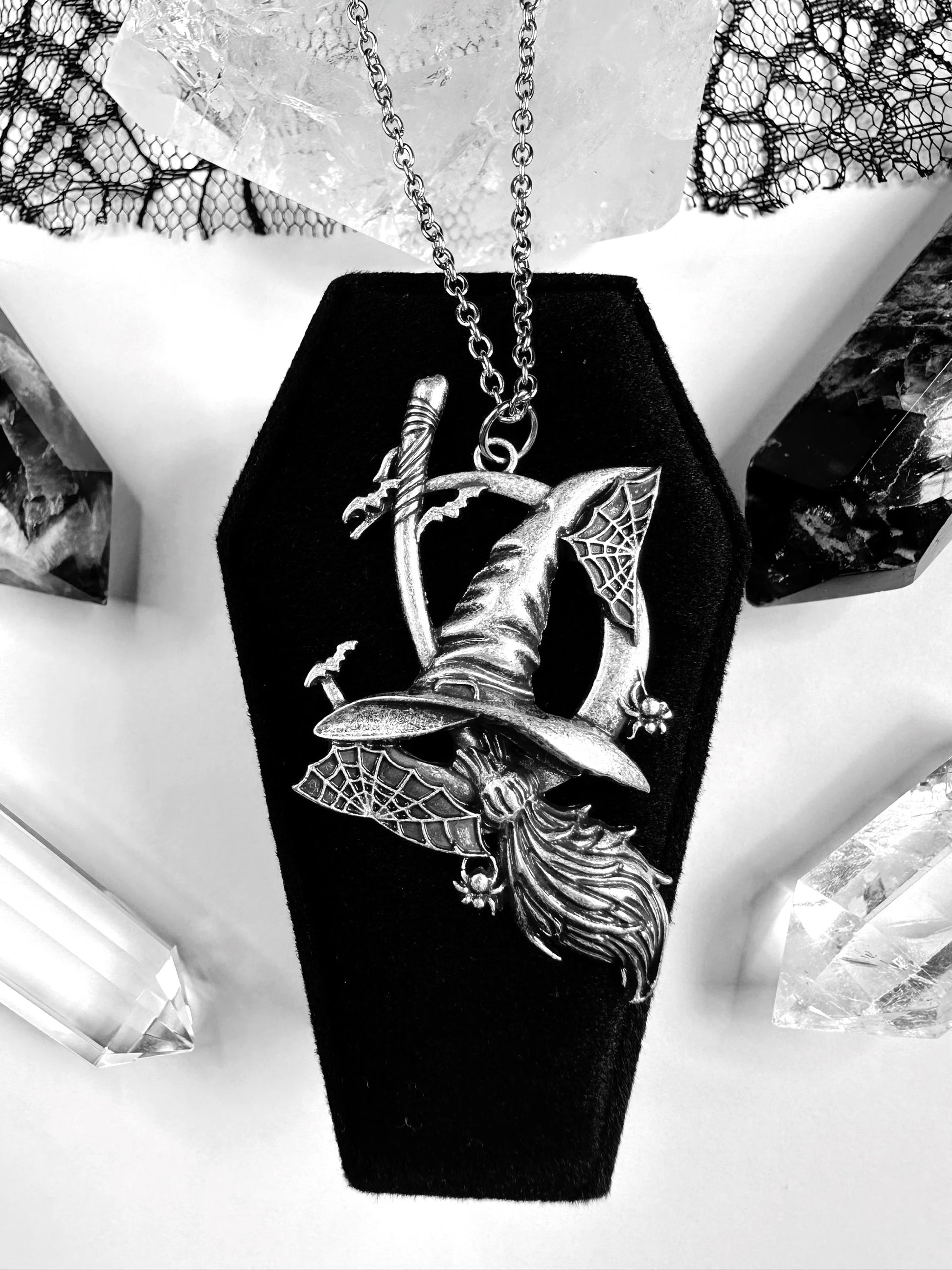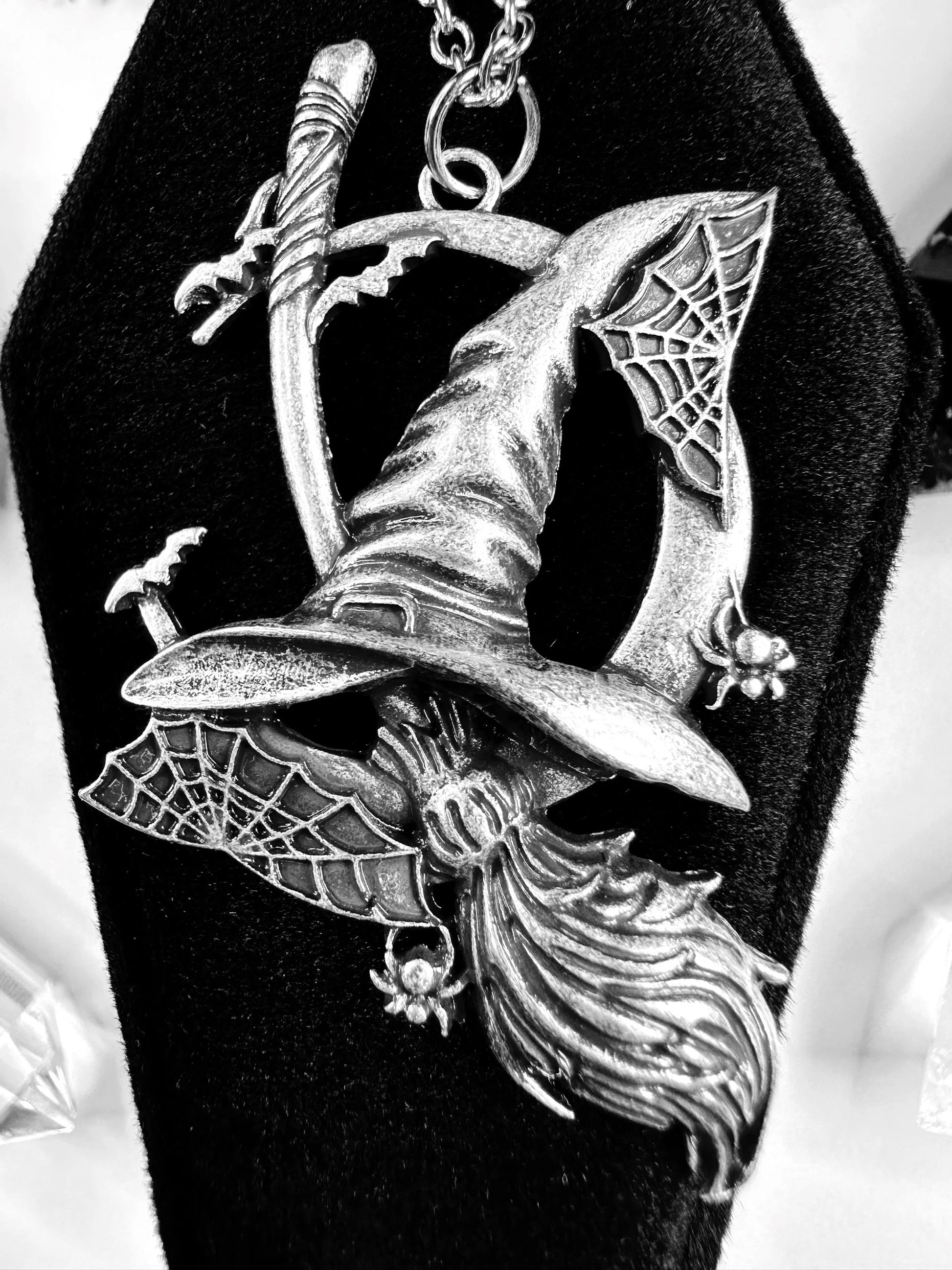 On A Stainless Steel Chain, Suspends An Absolutely Stunning Crescent Moon With A Witches Hat, Witches Broom , Spiders & Their Spiderwebs & Flying Bats To Detail
