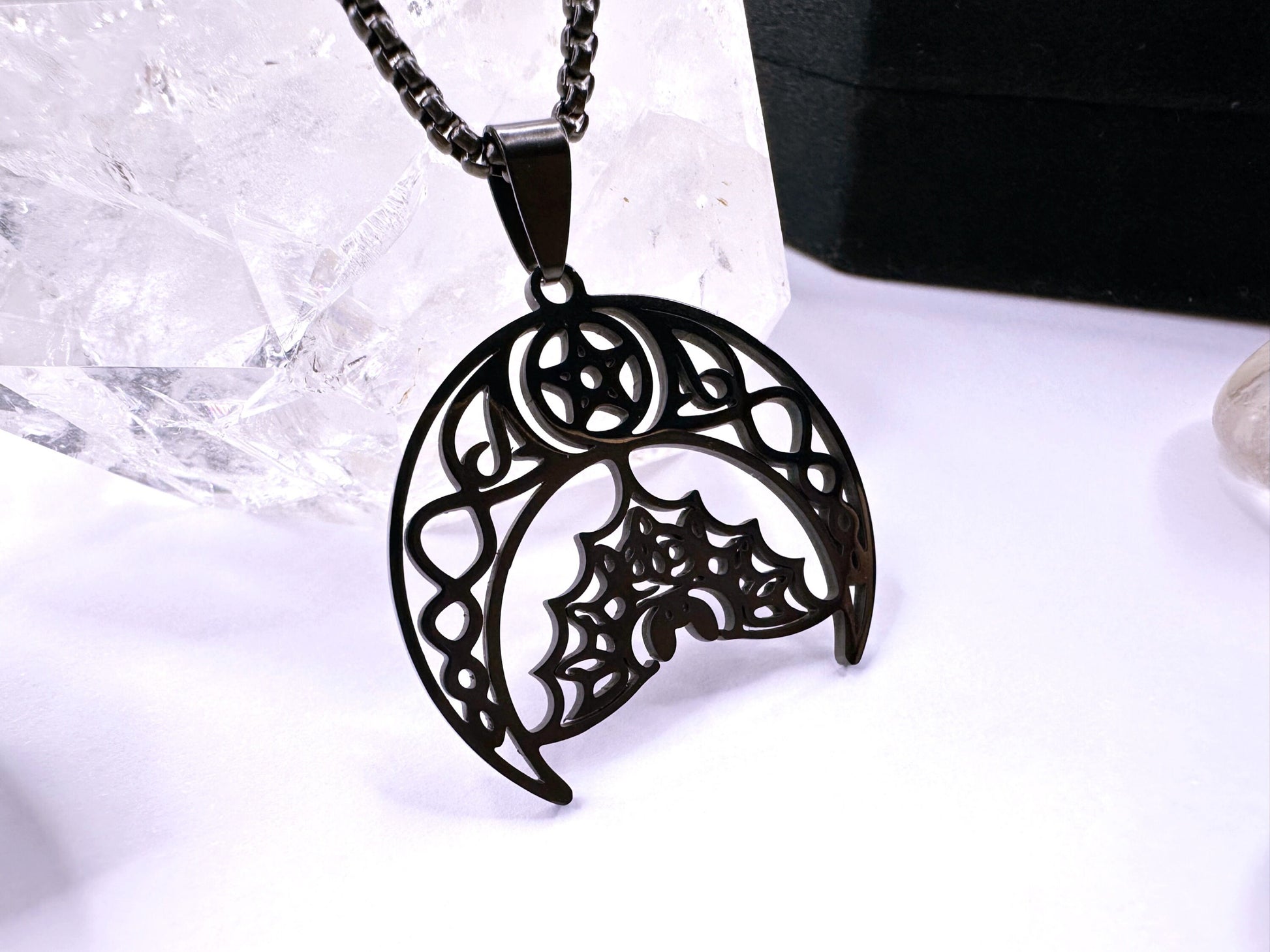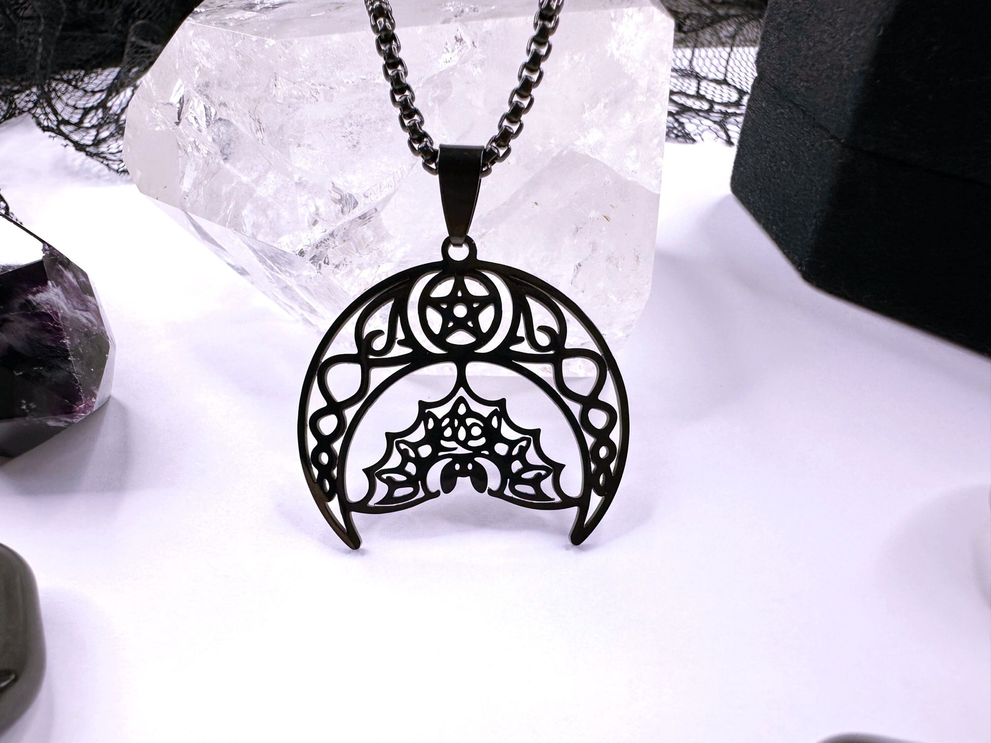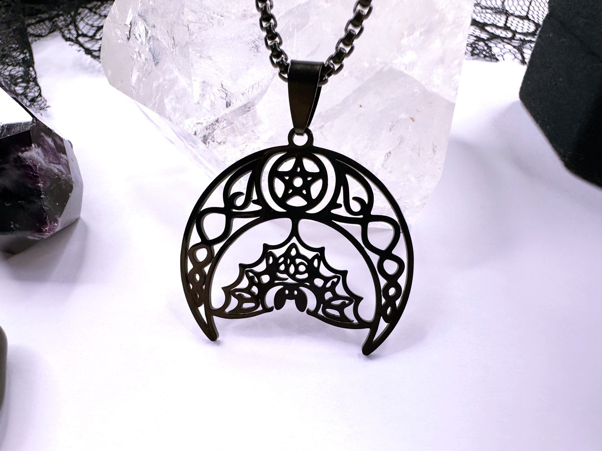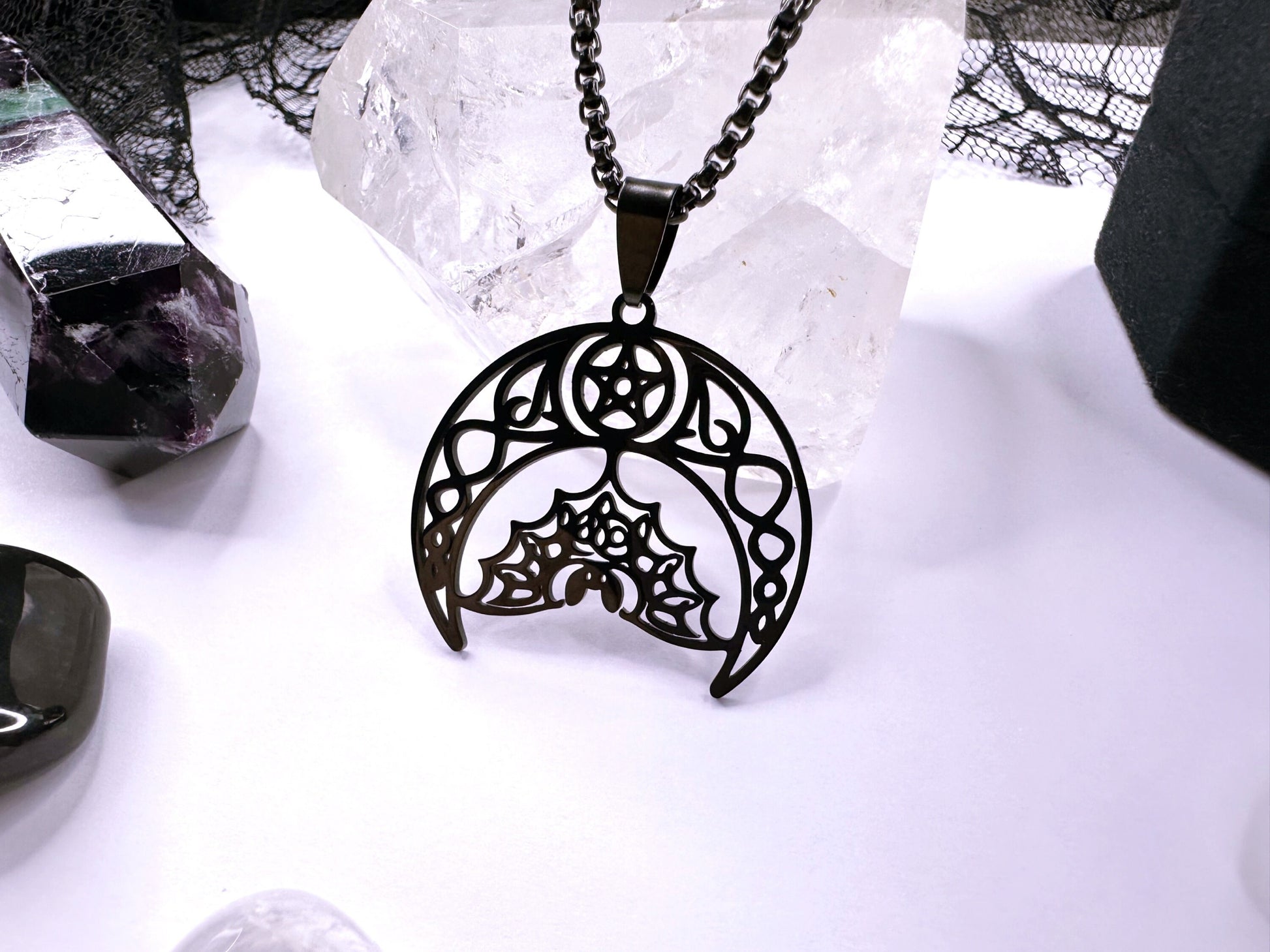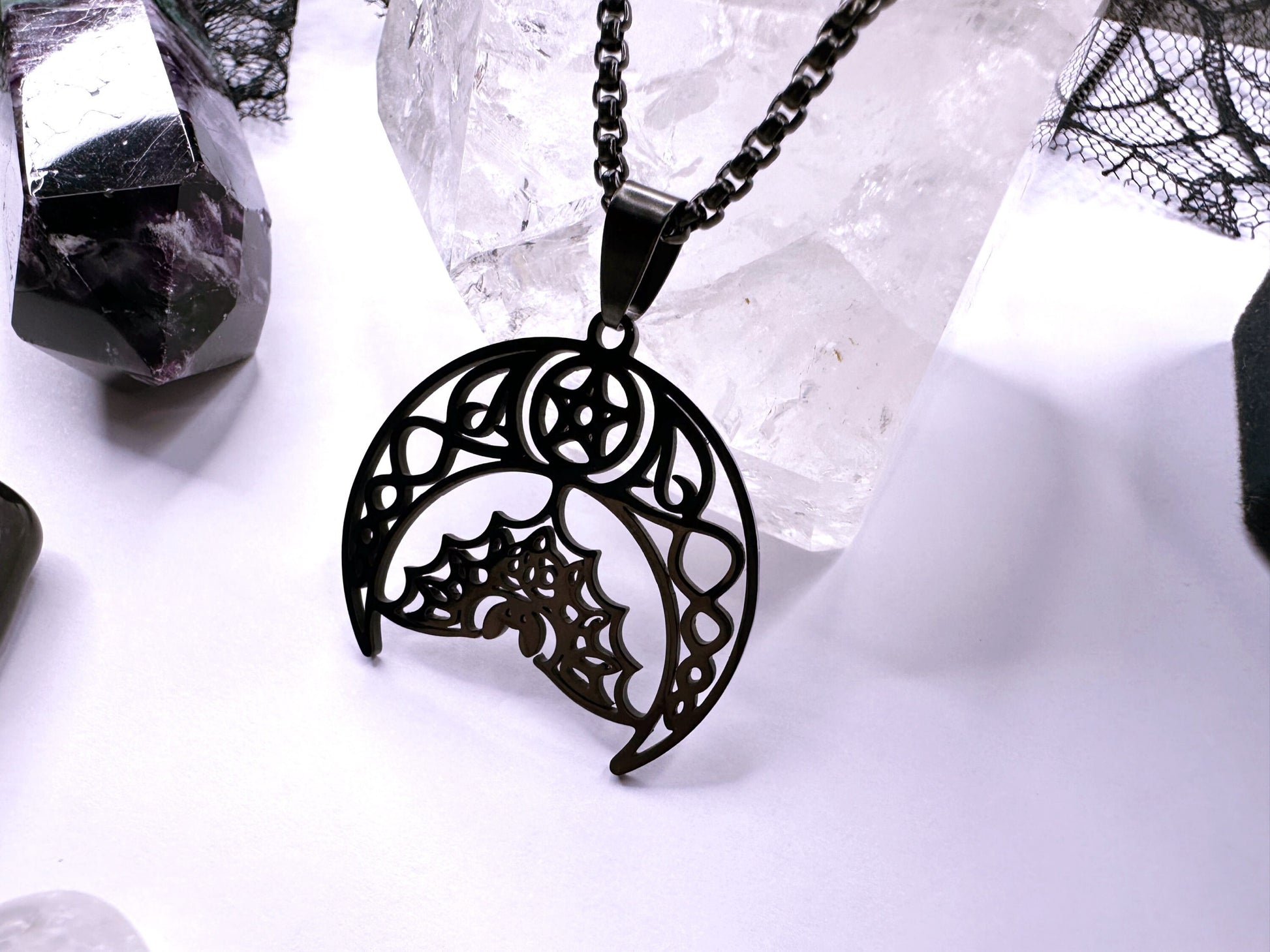 From A Black Stainless Steel Chain Sits An Ornate Filigree Crescent Moon With A Pentagram , Suspending A Gorgeous Black Bat , All Made From Stainless Steel