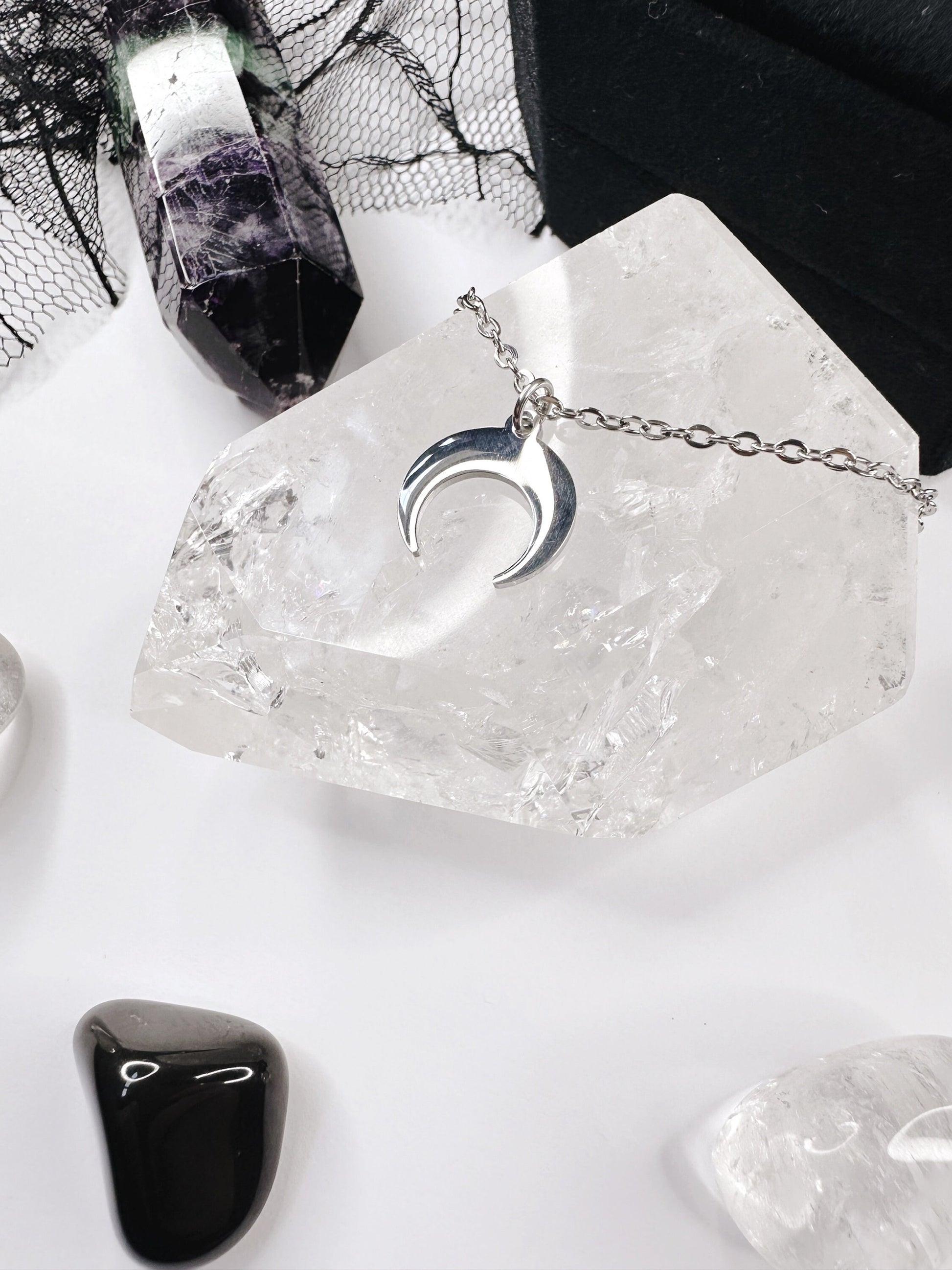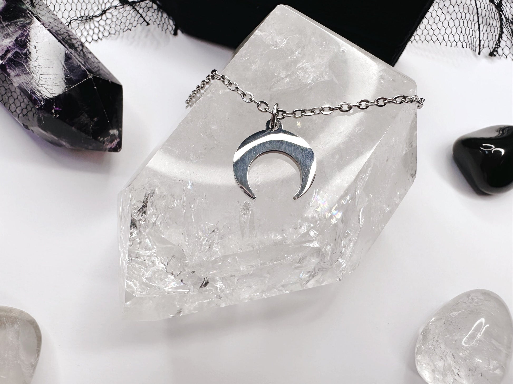 On A Stainless Steel Chain, Suspends An Absolutely Stunning Stainless Steel Crescent Moon