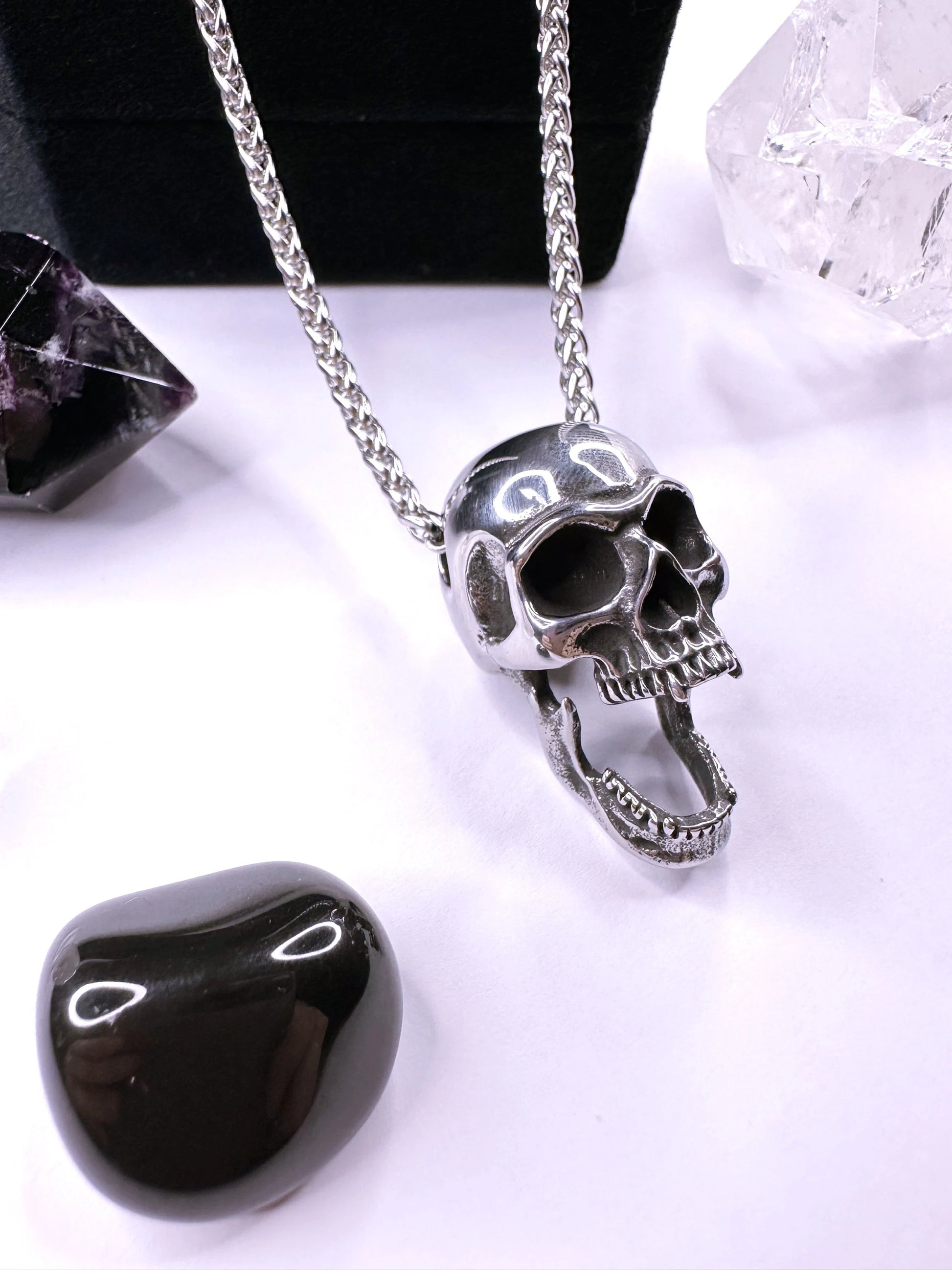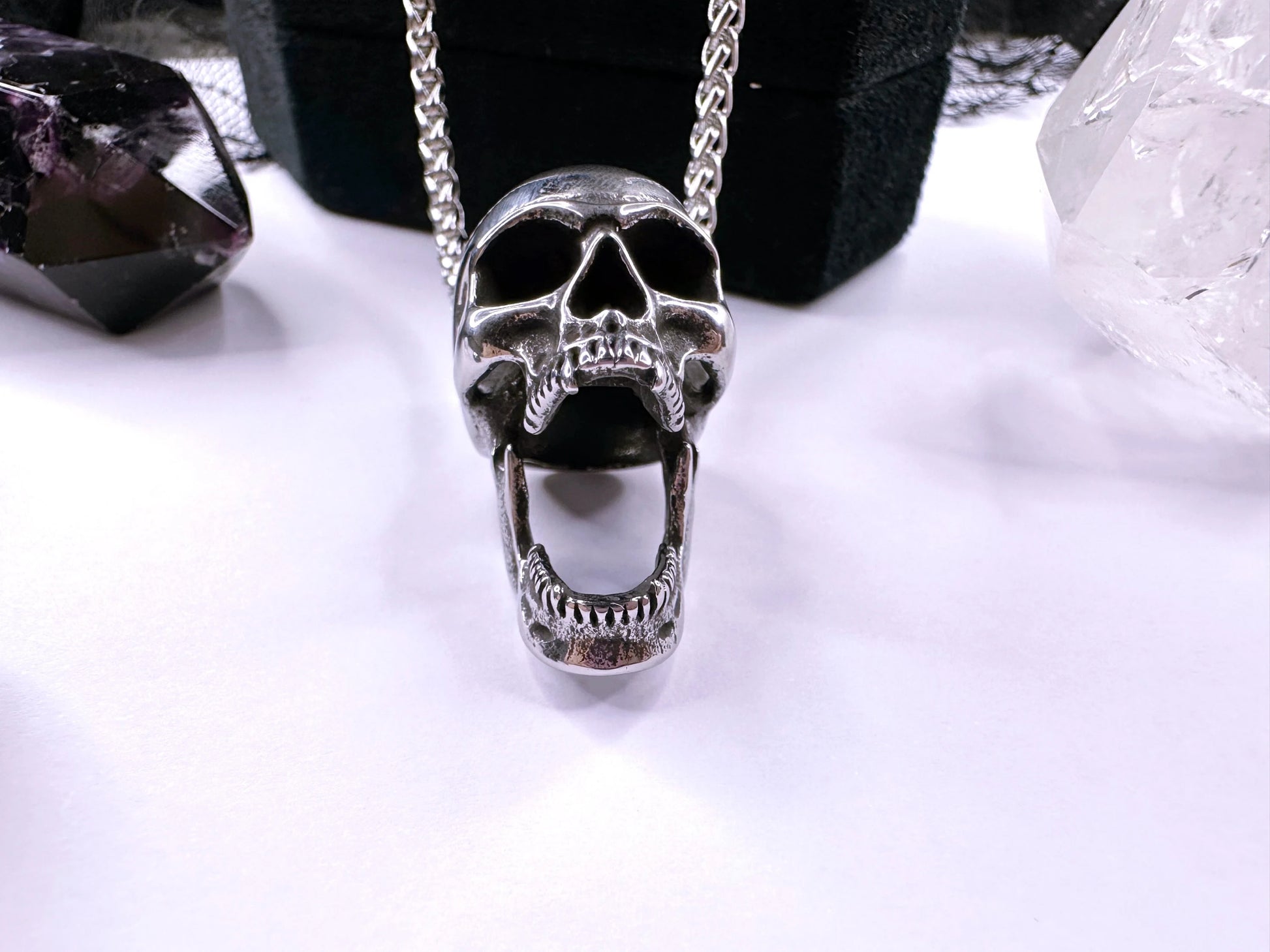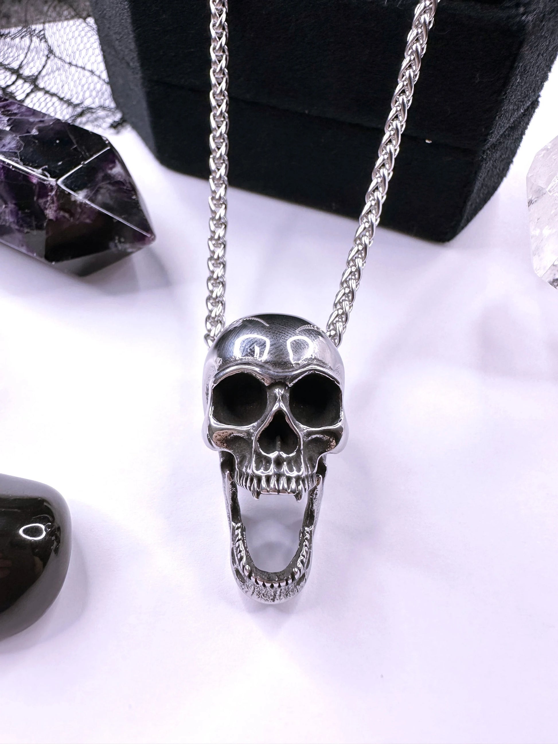 From A Stainless Steel Chain, Suspending A Gorgeous 3D Stainless Steel Skull Pendant With Fangs & Open Jaw