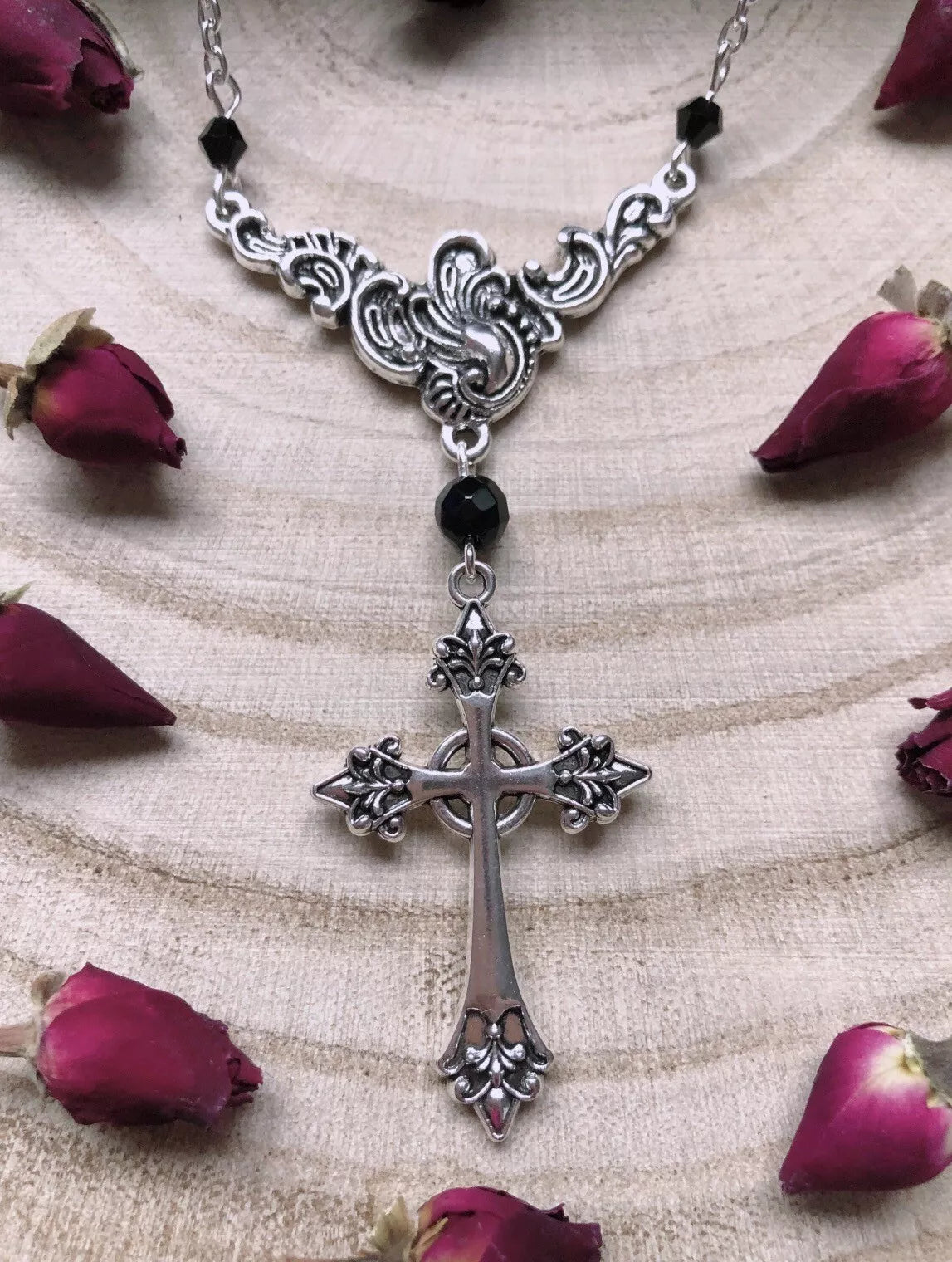 From A Silver Plated Chain Sits An Ornate Filigree Pendant, Suspending A Gorgeous Gothic Cross Adorned With Black Austrian Crystal Beads